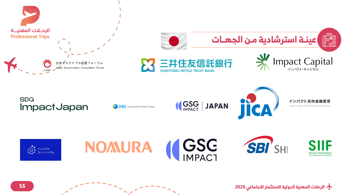 انضم إلينا في رحلة مهنية مميزة إلى اليابان، الوجهة الرائدة في الاستثمار الاجتماعي. تتيح لك هذه التجربة الفريدة فرصة لزيارة 10 منظمات فاعلة في مجال الاستثمار الاجتماعي، تشمل 5 شركات اجتماعية (Social Enterprises) تُقدم نماذج ناجحة تجمع بين الأثر والاستدامة، و5 جهات مُمكنة تدعم بيئة الاستثمار الاجتماعي مثل المؤسسات المانحة والمسرعات والمراكز البحثية. كما ستلتقي خلال الرحلة باثنين من الخبراء البارزين في مجال الاستثمار الاجتماعي، لتبادل الخبرات واستكشاف أبرز التجارب الدولية في بناء مشاريع تحقق الربح والأثر المجتمعي معًا. تستمر الرحلة لمدة 7 أيام (منها 5 أيام عمل) تشمل زيارات ميدانية ولقاءات مهنية نوعية، مع توفير الإقامة والتنقلات الداخلية والترجمة الفورية لضمان تجربة تعليمية ثرية ومتكاملة. (تذاكر السفر غير مشمولة).