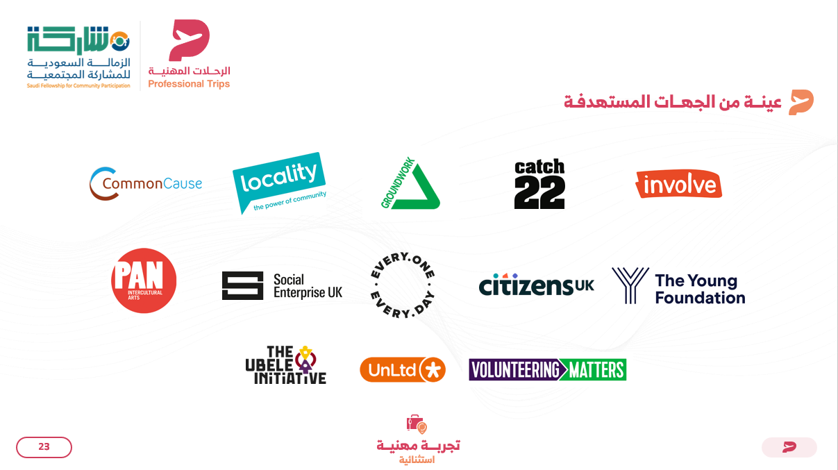 انطلق معنا في رحلة مهنية مميزة إلى لندن – المملكة المتحدة، لاكتشاف أبرز التجارب العالمية في مجال المشاركة المجتمعية وتمكين العمل الاجتماعي. تتضمن الرحلة زيارات ميدانية لعدد من المؤسسات والمنظمات الرائدة، ولقاءات مع خبراء دوليين في المجال لاكتساب رؤى وأفكار تعزز من أثر المبادرات المجتمعية داخل المملكة. تستمر الرحلة لمدة 7 أيام، منها 5 أيام عمل مليئة بالتجارب الثرية والتبادل المهني، وتشمل خدمات الترجمة الفورية لتسهيل التواصل ونقل المعرفة بفعالية. تشمل الرحلة الإقامة في فندق مريح مع وجبة الإفطار والتنقلات داخل المدينة. (تذاكر السفر غير مشمولة).