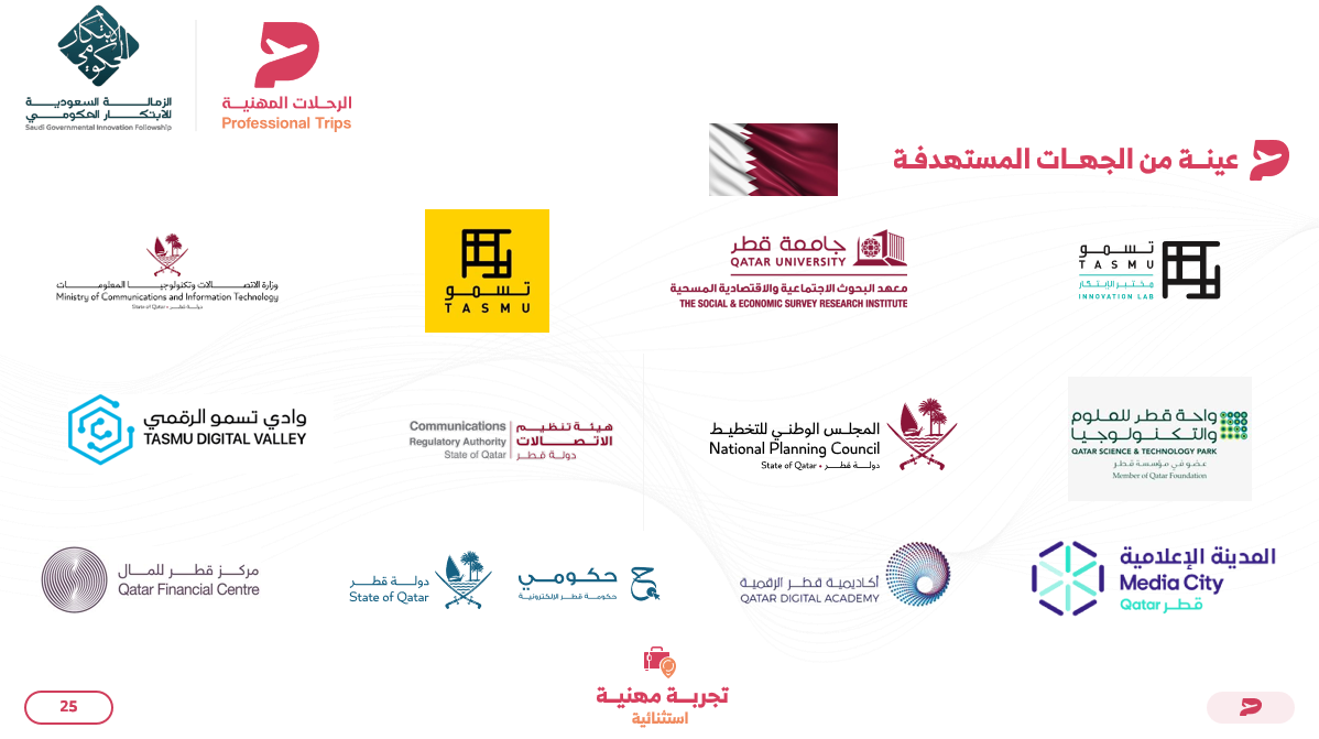 انضم إلى رحلة مهنية متخصصة إلى دولة قطر ضمن مسار الابتكار الحكومي، تركز على استكشاف التجارب الحكومية المتقدمة في تطوير الخدمات العامة والتحول الرقمي والابتكار المؤسسي. وتمثل التجربة القطرية نموذجًا إقليميًا متقدمًا في بناء حكومة مرنة تعتمد على التقنيات الرقمية، وتحسين تجربة المستفيدين، وتطوير السياسات العامة القائمة على البيانات، في إطار مبادرات وطنية مثل برنامج TASMU للتحول الذكي ورؤية قطر الوطنية 2030. تمتد الرحلة لمدة 7 أيام، تتضمن 5 أيام عمل مكثفة من الزيارات المهنية واللقاءات المباشرة مع خبراء وممارسين في الجهات الحكومية ومراكز الابتكار، مع التركيز على فهم آليات تطوير الخدمات الحكومية واستعراض نماذج التحول الرقمي وتحليل التجارب التطبيقية في تصميم السياسات المبتكرة، بما يسهم في نقل أفضل الممارسات وتكييفها مع السياق الحكومي في المملكة العربية السعودية دعمًا لتحقيق مستهدفات رؤية المملكة 2030. تشمل رسوم الرحلة التنسيق والتنظيم الكامل للبرنامج، والإرشاد المهني، والتنقلات أثناء الزيارات، والإقامة الفندقية شاملة الإفطار، إضافة إلى خدمات الاستقبال والتوصيل من وإلى المطار. ولا تشمل رسوم الرحلة الإعاشة، وتذاكر السفر، ورسوم التأشيرات.